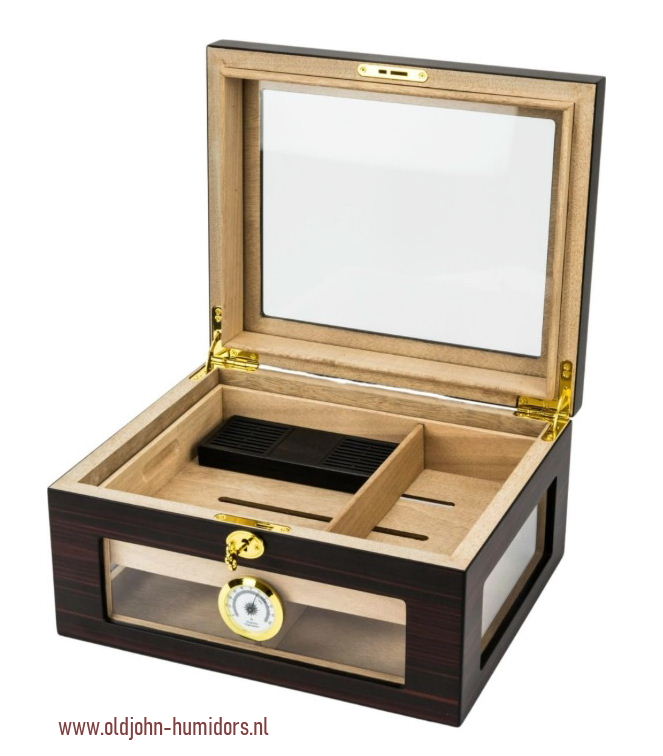 HUMIDOR EBONY - MAT GLAZEN DEKSEL - RONDOM DOORZICHT – SLOT – INZETTRAY