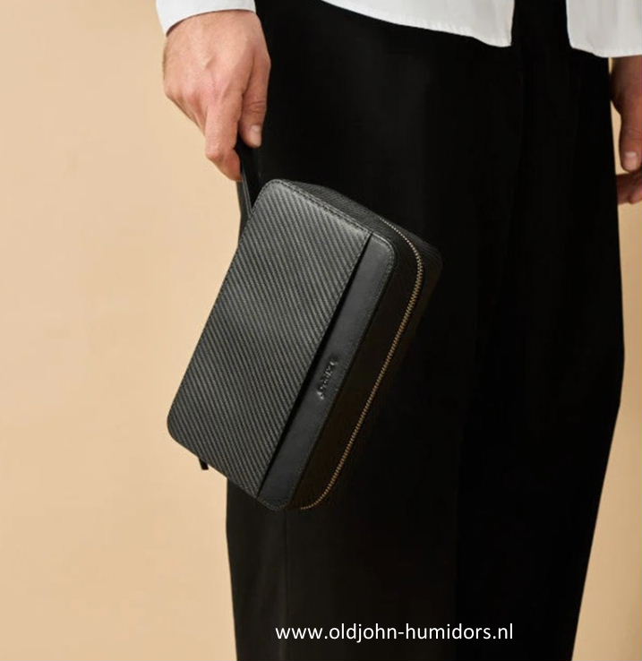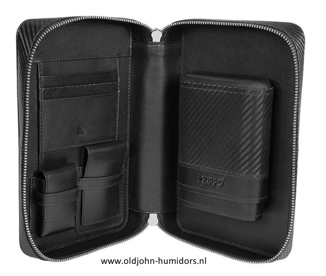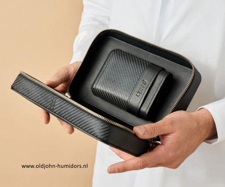 Stijlvol op reis met je sigaren en accessoires – veilig opgeborgen in deze luxe Zippo travelcase uitgevoerd in carbon-look leer.